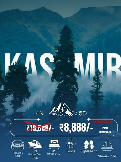 Escape to "Paradise on Earth" with our unforgettable Kashmir tour packages. Experience the serene beauty of Srinagar's Dal Lake with a traditional Shikara ride and a cozy stay on a houseboat. Explore the lush green meadows of Pahalgam and the snow-capped peaks of Gulmarg, home to the world's highest gondola. Our expertly crafted itineraries include iconic Mughal Gardens and the breathtaking vistas of Sonmarg. Book your dream Kashmir holiday today and witness the Himalayas' true splendor.